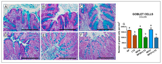 Goblet cells density in the colon of gnotobiotic piglets: Germ-free (GF; (A)), colonized with B. boum RP36 (RP36; (B)), colonized with B. boum RP37 (RP37; (C)), infected with S. Typhimurium LT2 (LT2; (D)), colonized with RP36 and infected with LT2 (RP36+LT2; (E)), and colonized with RP37 and infected with LT2 (RP37+LT2; (F)). Bars represent 500 µm. The goblet cell counts (G) are presented as mean + SEM. Statistical differences were calculated by one-way ANOVA with Tukey’s multiple comparison post-hoc test, and p-values < 0.05 are denoted with different letters above the columns. Six samples in each group were analyzed.