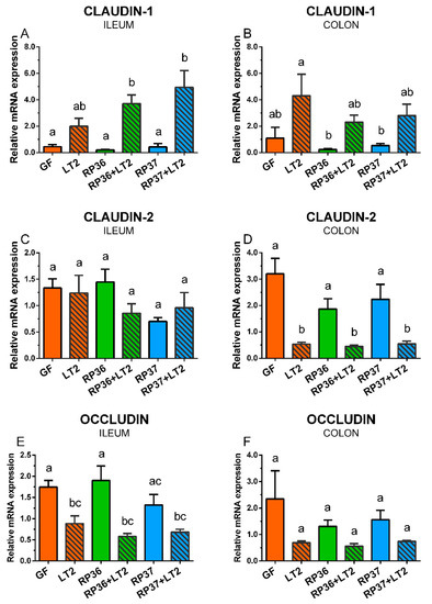 Expression of claudin-1 (A,B), claudin-2 (C,D), and occludin (E,F) mRNA in the ileum (A,C,E) and colon (B,D,F) of the gnotobiotic piglets: Germ-free (GF), infected with S. Typhimurium LT2 (LT2), colonized with B. boum RP36 (RP36), colonized with RP36 and infected with LT2 (RP36+LT2), colonized with B. boum RP37 (RP37), and colonized with RP37 and infected with LT2 (RP37+LT2). The values are presented as mean + SEM. Statistical differences were calculated by one-way ANOVA with Tukey’s multiple comparison post-hoc test, and p-values < 0.05 are denoted with different letters above the columns. Six samples in each group were analyzed.