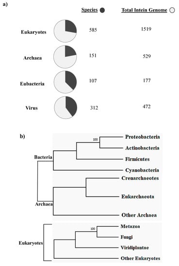 The first intein sequence was discovered 32 years ago in the Saccharomyces cerevisiae VMA1 gene that encodes for an alpha subunit of vacuolar H+ ATPase [34,35]. The translational product of the gene was calculated to be 118.6 KDa but experimentally estimated as 67 KDa. The deduced amino acid sequence shows similarity to other ATPase at N- and C-terminal regions, but the central region was not determined [34]. Experimental analysis by Kane et al. revealed the presence of two separate proteins of molecular weights 69 and 50 kDa [35]. Since then, further examples of inteins were found in all three domains of life—in archaea, the DNA polymerase of the extremely thermophilic archaebacteria Thermococcus litoralis [36], in bacteria, the RecA proteins of M. tuberculosis [37,38] and M. leprae [39] and in eukarya, the 69 kDa subunit of vacuolar ATPase of the yeast Candida tropicalis [40]. This highlights a wider distribution of inteins across all three domains of life (Figure 2b), suggesting an ancient origin that predates the separation of prokaryotes and eukaryotes [18,20,41]. We dug into the NCBI Gene data base (www.ncbi.nlm.nih.gov/gene) to scan the distribution of intein in all the three domains of life, where out of 2709 intein-containing genomes, 56% of total intein-containing genome is found in eukaryotes, 19.8% in archaea and 6.64% in eubacteria. We also performed an assessment for intein distribution in viruses and observed 17.4% of total intein-containing genome is present in viruses (Figure 2a).