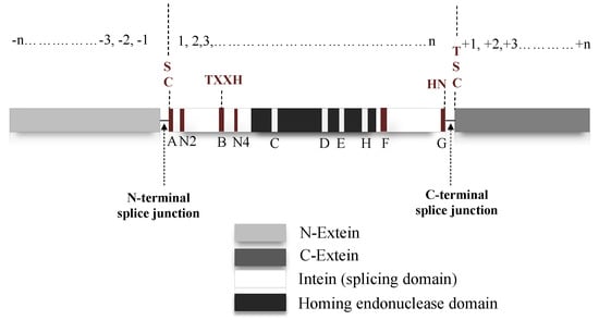 The splicing domain of intein is broadly divided into two subdomains: N- and C-terminal splicing domains. These regions consist of several conserved motifs containing conserved residues, which facilitate the initiation and completion of splicing activity (Figure 3). N-terminal intein contains A, N2, B and N4 structural motifs or Blocks, while F and G-Blocks are seen in the C-terminal intein [8,13,52,53]. A-Block typically has Cys/Ser or Thr as conserved residues. B-Block usually contains His and Thr residues and F-Block usually has Asp and His. Additionally, G-Block bears two conserved residues; a penultimate His and a terminal Asn. These are the critical residues that directly or indirectly assist in the splicing reactions. C, D, E and H-Blocks are dedicated for the homing endonuclease domain [13,53,64,65].