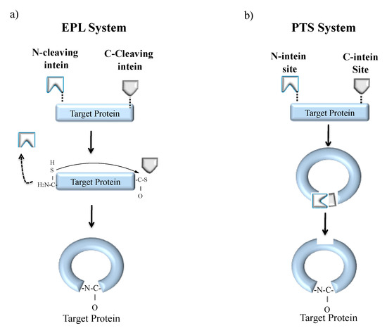 Cyclization is a process of joining the N- and C-terminal ends of protein via a peptide bond [127]. Naturally cyclized peptides are found in bacteria, plants and mammals that bear antimicrobial, anticancer, uterotonic, haemolytic and anthelmintic property [128,129]. One such naturally occurring cyclized peptide is cyclosporine, found in fungi that harbours an immunosuppressant property [20]. The advantage of polypeptide cyclization is the production of biologically active, fast-folding and denaturation-resistant recombinant proteins. Hence, cyclization of synthetic peptides is an area of interest in pharmaceutical industries. Backbone cyclization can be achieved both in vitro and in vivo systems either by EPL or PTS (Figure 8) [9,32]. The EPL-based cyclization method is achieved by fusing the target polypeptide N-terminus to a peptide leader sequence ending with a Cys residue while the C-terminus is fused to an engineered intein (Figure 8a). The N-terminal leader sequence can undergo cleavage in vivo or in vitro by a proteolytic or self-proteolytic event, leaving behind the N-terminal Cys residue on the target peptide. The Cys residue can then react with an α-thioester generated by the downstream intein, resulting in the formation of a backbone cyclized polypeptide. The first EPL mediated cyclization was reported by Camarero and Muir in 1999 [130]. They used the N-terminal SH3 domain of the c-Crk protein as a model system. The resultant circular protein folded faster and was more stable than the linear counterpart. Iwai and Plückthun used a similar approach for the biosynthesis of a circular beta-lactamase and green fluorescent protein (GFP) that was biologically active and more resistant to thermal denaturation [131].