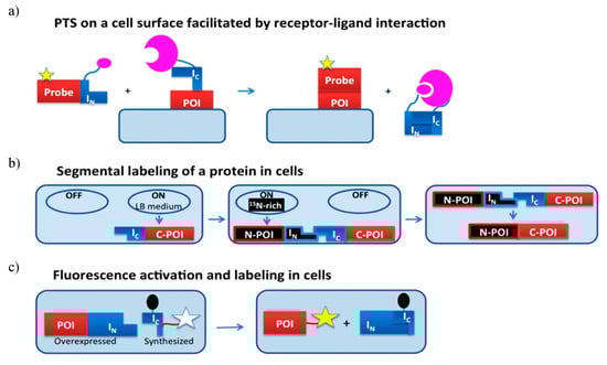 PTS technique can be further implemented for segmental isotopic labelling in vivo as well as the in vivo addition of chemical probes to specific target protein (Figure 9b). Split inteins consisting of either short IN fragment or short IC fragment are used. One such intein-based labelling process uses chemical ligation, to label glutathione-S-transferase (GST) and eGFP in both bacterial and mammalian systems. The target proteins are expressed as a C-terminal fusion to Ssp DnaB intein and an N-terminal Cys. The target protein is tagged using cell-permeable, thioester-containing small molecules like biotin or a fluorophore [143]. However, due to the absence of native affinity between the target protein and label, an excess of one reagent was required for successful ligation at the cost of a high background signal of unreacted reagent. Camerero and coworkers overcame these difficulties and used fluorescence resonance energy transfer (FRET) quenched with DnaE split intein in living cells to increase the affinity between target protein and probe [144]. The fluorescent label was a part of C-extein and the quencher was introduced on the IC intein segment to reduce the background signal. The PTS reaction results in ligation of fluorophores to the protein of interest (POI); subsequently, the quencher is released resulting in fluorescence activity (Figure 9c). A single culture can be used to produce labelled and unlabelled precursor fragments. The need for this dual expression system allows for the sequential expression of precursors in a media spiked with different labelling isotopes. The incorporation of unlabelled tags into isotopically labelled target protein was demonstrated by Züger and Iwai by sequentially overexpressing an unlabelled immunoglobulin binding protein G domain B1 (GB1) and labelled C-terminus of yeast prion protein Sup35, each fused to Ssp DnaE split-intein fragment. This fusion protein had improved solubility and stability provided by the NMR-invisible tag [145].