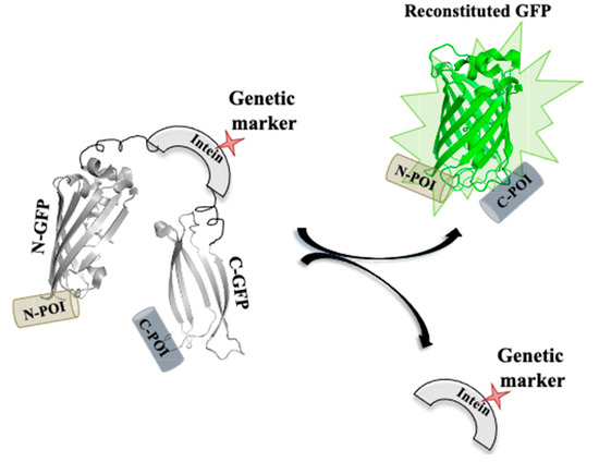 Inteins can be used as a genetic marker by facilitating in vivo gene modifications (Figure 10). Muller and coworkers modified the Pch PRP8 intein system with selectable markers, including amino glycoside, phosphotransferase, imidazoleglycerol-phosphate dehydratase hygromycin B phosphotransferase and transcriptional activator LexA-VP16 [149]. The enzymes as selectable markers were inserted at the site of the lost homing endonuclease domain. The interrupted inteins when expressed in E. coli had a higher splicing efficacy; moreover, when the modified inteins were expressed from a plasmid in S. cerevisiae, it had splicing efficiency greater than 96%. The sensitivity of internal GFP labelling can be further enhanced by the use of a split GFP–intein construct. Modified intein sequence can be fused with split GFP fragments in-frame with specific peptide (extein) sequences at both the ends. The excised intein under selective conditions can also serve as a selectable marker for the expression of reconstituted GFP fused to exteins on either side [9,149].