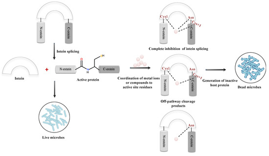 Inteins are sporadically distributed in the genomes of organisms spanning from archaea, bacteria, and eukaryotes to several viral and fungal genomes [20]. Since inteins also intervene in the functional domains of the precursor protein of pathogenic microorganisms, its splicing inhibition can generate an inactive protein that affects microbial viability. Thus, targeting inteins with splicing inhibitors would be a disrupting approach for future antimicrobial development, especially in the era of multidrug resistant (MDR)/extensively drug resistant (XDR) strains [28]. Cisplatin, an anticancer drug, has been extensively used and is a potent inhibitor of splicing mechanism [33]. Nevertheless, cisplatin being an anticancerous drug might possess critical side effects upon administering as an antimicrobial. Transition metal ions such as zinc and copper have also shown substantial ability to inhibit the splicing process. Inhibition of protein splicing is caused by metal coordination to active site residues instead of any structural changes in the protein (Figure 11). Since zinc coordinates to the active site residues, it inhibits protein splicing by restricting the mobility of the active site residues. Copper, however, plays a dual role in the inhibition of intein splicing by strongly coordinating to the key residues (including Cys1) and subsequent oxidation of Cys1 (critical residue for N-S acyl shift, the first step of intein splicing) [150,151]. Metal complexes targeting more than one intein system may have a broad spectrum application as antimicrobials against multiple pathogens. Current studies are conducted either in synthetic intein systems or with engineered mini-intein systems. Studies with native intein systems should thus be acknowledged for development of a novel microbial drug target, particularly for the treatment of infections caused by intein-containing pathogens.