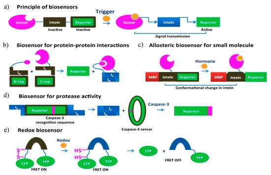 Intein-based biosensors are fabricated by utilizing independent protein domains, expressed within living cells. Most intein-based biosensor systems have three functional and structural modules: a sensing module, an intein-derived signal transducer, and an output module. CPS has been the foundation that lay to the development of intein-based biosensors. The signal of interest is accepted by the sensing module, which induces CPS in the intein module and subsequent activation of reporter protein, as shown by the output module (Figure 12a). Variation in the development of intein-based biosensors can help detect protein–protein interactions, sensing epigenetic modulations, detection of small molecules, changes is protease activity and redox states, individually. Design strategies with orthogonal split-inteins was used for the development of multiplexed intein-based sensors [152].