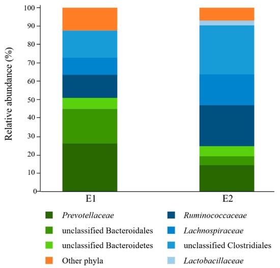 Family-level taxonomic composition of ruminal bacterial communities of the rumen fluid donors (E1, n = 1; E2, n = 1) used in this study. Families belonging to the same phylum are represented by different shades of the same color (Bacteroidetes: green; Firmicutes: blue). E1: D0 sample from Experiment 1; E2: D0 sample from Experiment 2.