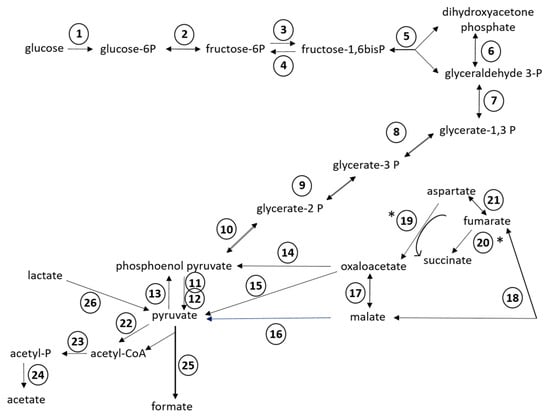 Predicted metabolic reactions for fermentation of glucose into short chain fatty acids (SCFAs) from the annotated genomic sequences of SD_Bt-00010. Unidirectional arrows indicate that an enzyme is predicted to only catalyze a reaction in one direction, while bidirectional arrows indicate that the same enzyme can catalyze both forward and reverse reactions [36]. (*) indicates the predicted direction under anaerobic conditions. Enzymes displayed are: (1) hexokinase (EC 2.7.1.2); (2) glucose-6-phosphate isomerase (EC 5.3.1.9); (3) 6-phosphofructokinase (EC 2.7.1.11); (4) fructose-1,6-bisphosphatase (EC 3.1.3.11); (5) aldolase (EC 4.1.2.13); (6) triosephosphate isomerase (EC 5.3.1.1); (7) glyceraldehyde-3-phosphate dehydrogenase (EC 1.2.1.12); (8) phosphoglycerate kinase (EC 2.7.2.3); (9) 2,3-bisphosphoglycerate-independent phosphoglycerate mutase (EC 5.4.2.1); (10) enolase (EC 4.2.1.11); (11) pyruvate kinase (EC 2.7.1.40); (12) pyruvate phosphate dikinase (EC 2.7.9.1); (13) phosphoenolpyruvate synthase (EC 2.7.9.2); (14) phosphoenolpyruvate carboxykinase (EC 4.1.1.49); (15) oxaloacetate decarboxylase (EC 4.1.1.112); (16) NADP-dependent malic enzyme (EC 1.1.1.40); (17) malate dehydrogenase (EC 1.1.1.37); (18) fumarase/fumarate hydratase (EC 4.2.1.2); (19) aspartate oxidase (EC 1.4.3.16); (20) fumarate reductase/succinate dehydrogenase (EC 1.3.1.6); (21) aspartate ammonia lyase (EC 4.3.1.1); (22) pyruvate-flavodoxin oxidoreductase (EC 1.2.7.-); (23) phosphate acetyltransferase (EC 2.3.1.8); (24) acetate kinase (EC 2.7.2.1); (25) pyruvate formate lyase (EC 2.3.1.54); (26) candidate operon for lactate utilization (see Figure 3A).
