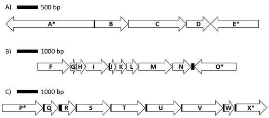 Genomic organization for genes encoding proteins involved in lactate utilization (A), the ATP synthase complex (B) and arabinose metabolism (C). Coding sequences are represented by arrows, while intergenic regions are shown as solid boxes. Available contig sequences permitting, genes flanking coding sequences of interest are indicated by (*). Annotated protein/enzymes displayed are (A) DNA topoisomerase; (B) L-lactate dehydrogenase, Fe-S oxidoreductase; (C) lactate utilization domain protein; (D) lactate utilization domain protein; (E) DegT/DnrJ/EryC1/StrS aminotransferase family; (F) F0F1 ATP synthase subunit beta; (G) F0F1 ATP synthase subunit epsilon; (H) hypothetical protein; (I) F0F1 ATP synthase subunit A; (J) F0F1 ATP synthase subunit C; (K) F0F1 ATP synthase subunit B; (L) F0F1 ATP synthase subunit delta; (M) F0F1 ATP synthase subunit alpha; (N) F0F1 ATP synthase subunit gamma; (O) fructose 1,6 bisphosphatase; (P) sodium solute symporter; (Q) nudix hydrolase; (R) L-ribulose-5-phosphate 4-epimerase; (S) L-arabinose isomerase; (T) FGGY-family carbohydrate kinase; (U) alpha-N-arabinofuranosidase; (V) transketolase; (W) ribose 5 phosphate isomerase; (X) pyruvate kinase.