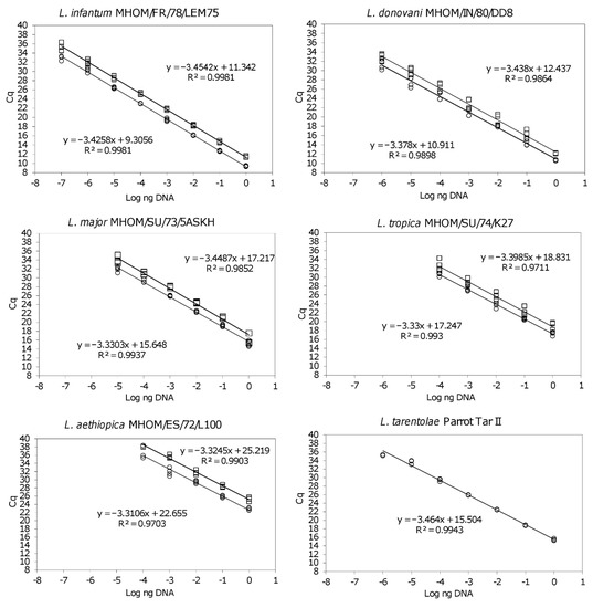 Standard curves were established using 1 × 100 to 1 × 10−7 ng DNA of L. (L.) major MHOM/SU/73/5ASKH, L. (L.) donovani MHOM/IN/80/DD8, L. (L.) aethiopica MHOM/ET/72/L100, L. (L.) tropica MHOM/SU/74/K27, L. (L.) infantum MHOM/FR/78/LEM75 and L. (S.) tarentolae Parrot Tar II. To evaluate the potential interference of host DNA as background in the qPCR assay, 30 ng of human DNA purified from human cell line (CACO-2 or MCF7) was spiked in each qPCR reaction tube (with the exception of L. (S.) tarentolae Parrot Tar II because not pathogenic to humans). The standard curves were obtained from two independent experiments for each strain, processed in duplicate.