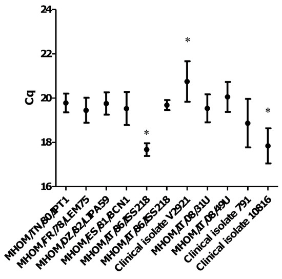 qPCR-ML Cq values obtained from 11 L. (L.) infantum strains/isolates. The results were obtained from six independent experiments. * p < 0.01 Dunn’s Multiple Comparison Test.