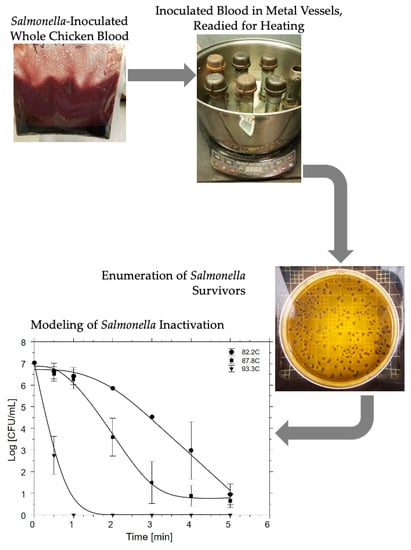 Flow process depiction of Salmonella lethality determination from heating of pathogen-inoculated whole chicken blood.