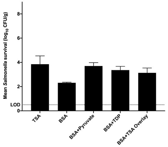Mean numbers of survivors of Salmonella enterica recovered from whole chicken blood subjected to heating for 3.0 min at 93.3 °C (p = 0.130; pooled standard error = 0.565). Bars depict means from three identically completed replicates (N = 3); error bars present one standard error. Salmonella cells were enumerated on tryptic soy agar (TSA), bismuth sulfite agar (BSA), BSA supplemented with 0.1% (w/v) sodium pyruvate (BSA ± Pyruvate), BSA supplemented with 0.1% (w/v) 3,3′-thiodipropionic acid (BSA ± TDP), or BSA with TSA overlay. Salmonella colonies were enumerated after plates were incubated at 36 ± 1 °C for 24–48 h.