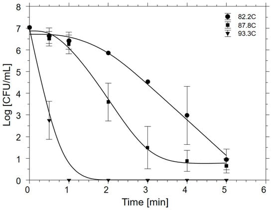 All preliminary and research experiments were replicated three times in identical fashion; experiments for D-value determination were designed as a full factorial, randomly assigning samples by three targeted heating temperatures (82.2, 87.8, or 93.3 °C) and seven heating periods (0.0, 0.5, 1.0, 2.0, 3.0, 4.0, and 5.0 min). Plate counts of Salmonella were log10-transformed prior to data analysis. Survivor data generated from replicates of thermal lethality experiments (Section 2.4) were then fit to non-log-linear models using the freeware Microsoft, Inc. (Redmond, WA, USA) Excel® add-in GInaFiT v.1.7 [14], identifying the best fitting model(s) by use of adjusted R2 and root mean square error (RMSE) outputs as indices of a model’s goodness of fit to data. GInaFiT-returned parameters of the fitted model: