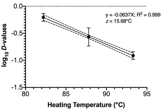 Thermal process constant (z-value) for Salmonella enterica inoculated and heated in whole chicken blood. Symbols depict mean calculated from three identically completed replicates (N = 3); error bars depict one standard error. Dashed lines present the 95% confidence limit boundaries.