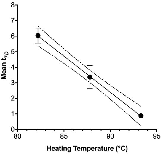 Buchanan et al. [23] previously recommended the use of a desired cumulative lethality process, arbitrarily set at t4D, as compared to designing a process strictly according to a multiple of the D-value. Jackson et al. [24] followed this approach for producing a predicted 5.0 log10 CFU/g inactivation of E. coli O157:H7 cells in ground beef patties during cooking. This method bears a distinct advantage in designing and validating thermal processes when microbial death kinetics are known or suspected to not follow a strictly log-linear kinetic, such as in the current report. The txD metric facilitates the processor accounting for the existence of a shoulder and/or tail in the identification of processing time needed for desired lethality and should produce a more conservative estimate of the needed processing conditions to achieve desired food safety hazard reduction. As was stated above (Section 3.3), the USDA-FSIS [16] mandates a performance objective of a 7.0 log10-cycle inactivation of Salmonella in poultry-derived human food. In the current study, t7D values for Salmonella differed by targeted heating temperature, with each t7D at a specific heating temperature differing from those of the other two (p = 0.001; Figure 5). Juneja et al. [25] previously recommended that food processors apply a txD for achieving a desired lethality performance objective, even recommending the application of the upper limit of a 95% confidence limit for the sake of producing conservative processing schedules for pathogen control. In the present study, mean t7D values declined from 6.04 at 82.2 °C, to 3.37 min at 87.8 °C, and to 0.88 min at 93.3 °C. Processing at 82.2 °C or 93.3 °C, each with incorporation of the 95% confidence limit, would require processing periods of 8.09 or 1.45 min at 93.3 °C, respectively (Figure 5). These would represent conservative processes for the rendering of chicken blood, with a high degree of Salmonella lethality generally assured.
