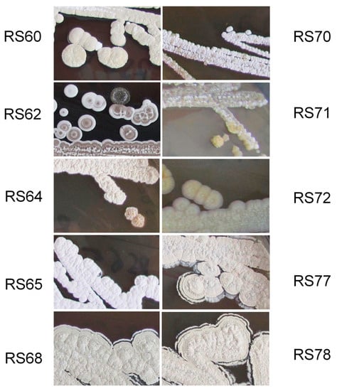 In order to determine if these four C. welensii larvae hosted any actinomycete bacteria in their intestinal tract, different dilutions of mixtures of their intestines and feces were spread onto ISP2 and R2YE plates containing 25 μg/mL of nalidixic acid and 50 μg/mL of cycloheximide. After two weeks of incubation at 28 °C, 24 colonies with actinomycete morphological characteristics were selected. Three of the colonies were isolated from plates inoculated with the mixture of intestinal extracts and the remaining 21 colonies from plates inoculated using a feces mixture. All isolates were re-inoculated onto new R2YE plates to obtain axenic cultures and were conserved in 20% glycerol. The three strains isolated from the intestine were numbered RS60 to RS62 and those isolated from feces were numbered RS63 to RS83. A picture of 10 of the 24 isolated actinomycetes is shown in Figure 1.