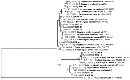 Phylogenetic analysis. Maximum likelihood phylogenetic tree generated using 16S rRNA sequences (the sequence of E. coli was used as the outgroup). Accession numbers are shown in brackets. Branch length is measured in number of substitutions per site (Scale Bar = 0.1). Bootstrap values based on 1000 replicates are shown next to the nodes. The actinomycetes isolates from the feces of C. welensii are marked with squares, while the isolates from the intestine are marked with triangles.