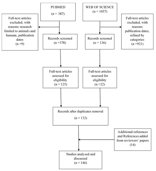 The search for articles corresponding to the MeSH terms used in the PubMed search database resulted in 387 articles. By focusing on animal and human microbiota and limiting research to the publication range to between 20 March 2008 and 3 February 2020, 378 articles were retained. The Web of Science search database generated 1057 articles using the keywords mentioned above. By limiting the research to the domain of microbiology and parasitology and to the year of publication (2008–2018), 136 articles were retained. The evaluation of the title and text of 378 PubMed articles and 136 Web of Science articles involving the bacterial community in relation to protozoa, helminths and fungi resulted in 125 and 22 articles, respectively. The introduction of eligible articles by both search engines into the bibliographic database, Zotero (www.zotero.org), eliminated duplicates and 132 articles were retained. Considering reviews of the relationships between bacterial and protozoa, helminths, or fungal communities, 14 articles of interest were added to the bibliographic database and 146 articles were included for qualitative synthesis (see Figure 1 for details).