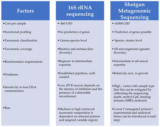 Summary of some differences between the 16S RNA sequencing methods and the metagenomic sequencing shutgun [65,66,67,68,69,70,71,72].