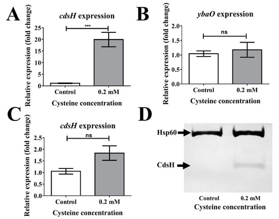 Since our results show that cdsH and ybaO participate in the adaptation to the presence of exogenous cysteine, we explored whether this amino acid induces the expression of these genes. For this purpose, RT–qPCR and Western blot assays were carried out from cultures in M9-glucose medium alone (control) or M9-glucose supplemented with 0.2 mM cysteine. As shown in Figure 2, the addition of cysteine induced the expression of cdsH only when the ybaO gene was present (Figure 2), corroborating the previous work of Oguri et al. (2012) [11]. By contrast, in a ΔybaO context, this induction was not observed (Figure 2C). Regarding the expression of ybaO, we found that, under the tested condition, the addition of cysteine produced no effect compared with the M9-glucose alone (Figure 2B), which can be explained by the negative self-regulation of the LRP regulator family [33].