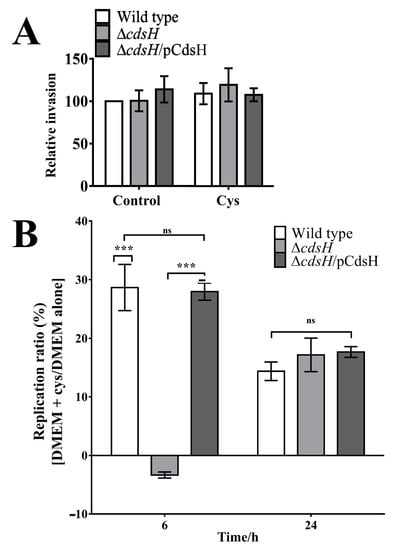 3.3. Cysteine Promotes Replication of S. Typhimurium inside Epithelial Cells in a cdsH-Dependent Manner
