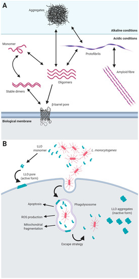 The role of functional amyloids as toxins. (A) Environmental conditions influence the aggregation state and kinetics of amyloid proteins. The folding of amyloid proteins into different structures is modulated by environmental conditions, i.e., pH, as exemplified in this figure. Protein monomers are able to form stable dimers that adopt a beta-hairpin structure, which in contact with biological membranes switch to a β-barrel pore. Furthermore, monomers are able to assemble into oligomers that finally give rise to mature amyloid fibres. At non optimal conditions, misfolded monomers or oligomers tend to form amorphous aggregates that finally can lead to the formation of protofibrils or β-barrel pores when appropriate conditions are met. (B) Mechanism of action of LLO toxin of L. monocytogenes. The bacteria secretes monomers of LLO that form stable dimers that are able to oligomerize building pores through the interaction with biological membranes. Inside of the phagolysosome, the toxin is secreted by the bacteria, limiting ROS production and causing the lysis of the lysosome, which contributes to the survival of the pathogen. LLO is also implicated in apoptosis and mitochondrial fragmentation. At alkaline conditions, such as the ones found in the cytoplasm, LLO monomers are unable to polymerize and tend to form amyloid aggregates which inactivate the cytotoxic activity of the protein [125].