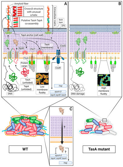 The TasA system in B. subtilis. The figure depicts the current knowledge regarding the TasA system in B. subtilis by showing two situations in the presence or absence of TasA. Biofilm formation requires the matrix proteins TasA and TapA, that are both essential for extracellular matrix production (ECM) and other cell functions, and the signal peptidase SipW. The biofilm schemes shown in the lower part of the figure include ECM producers (red), motile cells (blue), sporulating cells (green) and dead cells (dashed). (A). The TasA amyloid fibres provide structure to the ECM and exhibit a cross-β structure with a particular proportion of α –helix. These fibres are anchored to the cell surface by TapA, which also promotes TasA fibrillation and can be found as part of the fibres. In addition, TasA is also found in the cell membrane, where it maintains membrane stability, hypothetically, in proximity to functional membrane microdomains [140]. Under biofilm-inducing conditions, the expression of the matrix genes is maintained by the biofilm motility switch, which it has been recently reported to include the two-component response regulator CssS/CssR, that might sense TasA repressing the expression of flagellar genes [141]. (B). The absence of TasA leads to an increase of the cell death within the bacterial population, caused by a destabilization of the cell membrane and the subsequent alteration of membrane dynamics, which leads to the mislocalization of the flotillin FloT and other cellular disturbances such as DNA damage [140]. (C). In addition, TasA promotes motility by an unknown mechanism in a subset of the biofilm cells that allow for the proper expansion of the colony [141].