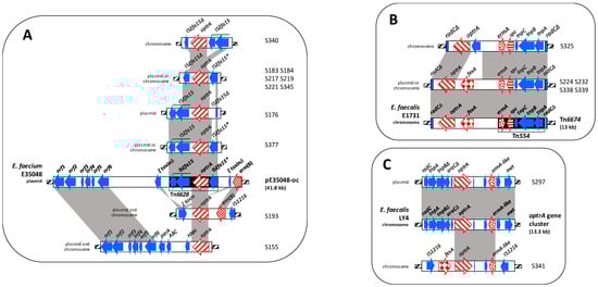 - Càmara, J.; Camoez, M.; Tubau, F.; Pujol, M.; Ayats, J.; Ardanuy, C.; Domínuguez, A.M. Detection of the novel optrA gene among linezolid-resistant enterococci in Barcelona, Spain. Microb. Drug. Resist. 2019, 25, 87–93. [Google Scholar] [CrossRef] [PubMed]