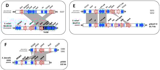 Type E: This optrA genetic context was observed in S251 and S252 isolates. The optrA environment (16,588 bp in size), flanked by two IS1216, showed three areas of identity with the pWo27-9 plasmid of S. sciuri (accession no. KX982169) []. In both isolates, the optrA gene, showing opposite orientation than that in pWo27-9, was linked to cfr (bracketed by istA-istB element and a transposase), ble, and aph(2″)-IIIa resistance genes (Figure 1E).