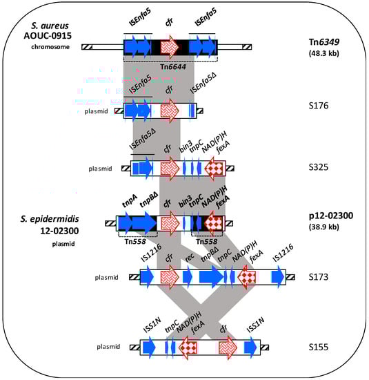 In S325, the region including the cfr gene exhibited a high degree of identity (99%) to different areas: (i) the fexA-containing region (6.5 kb) of S. epidermidis p12-02300 plasmid (accession no. KM521837.1) [], and (ii) the cfr-carrying region of Tn6644 of S. aureus AOUC-0915; however, upstream of the cfr gene a single ISEnfa5 was detected, which was shorter due to a 396-bp deletion in the first transposase (Figure 2).