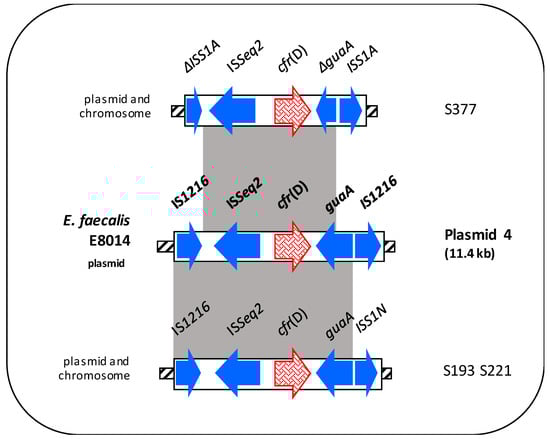 The cfr(D) context detected in E. faecalis S221 and E. hirae S193 was identical to the corresponding region in the plasmid 4 of E. faecium E8014 except for the IS element upstream of guaA (ISS1N instead of IS1216) []. In E. faecalis S337, the cfr(D) genetic context was flanked by ΔISS1E and ISS1A elements and showed the presence of a truncated guaA gene downstream of cfr(D) (Figure 3).