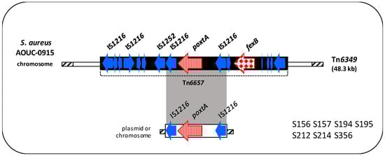 The poxtA context detected in seven isolates was always flanked by two IS1216 and identical to the corresponding region of Tn6657 transposon from S. aureus AOUC-0915 (Figure 4) [].