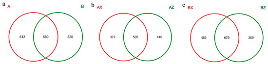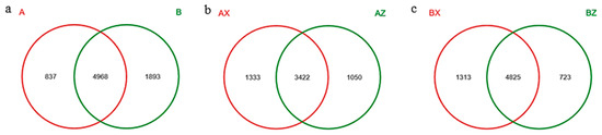 Venn diagram sample analysis. (a) Plantation forest (A) and original forest (B), showing the OTU numbers of bacteria; (b) middle litter layers in plantation forest (AZ) and lower litter layers in plantation forest (AX), showing the OTU numbers of bacteria; (c) middle litter layers in original forest (BZ) and lower litter layers in original forest (BX), showing the OTU numbers of bacteria.