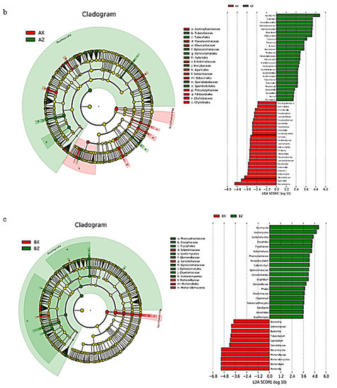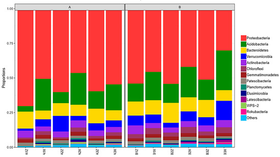 A Venn diagram is used to show the number of OTUs contained in the four groups. There were a total of 4968 OTUs in the two forest types, among which 837 were specific to A and 1893 were specific to B (Figure 1a). There were 3422 OTUs in the middle and lower layers of the plantation forest, of which 1050 were AZ-unique and 1333 were AX-unique (Figure 1b). The number of core OTUs in the middle and lower layers of the original forest was 4825, among which 723 were BZ-specific and 1313 were BX-specific (Figure 1c). Principal component analysis of the bacterial community composition of the four groups of forest litter in the plantation forest and the original forest showed that the differential contribution value of the first component was 37.39%, the second component 17.863%, and the third component 17.024%. In terms of the three principal components, the bacteria of the plantation forest and the original forest could be significantly separated, indicating that the bacterial community structures of the plantation forest and the original forest were significantly different (Figure A1, Appendix A).