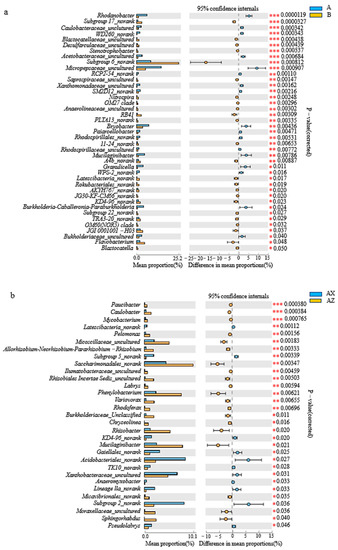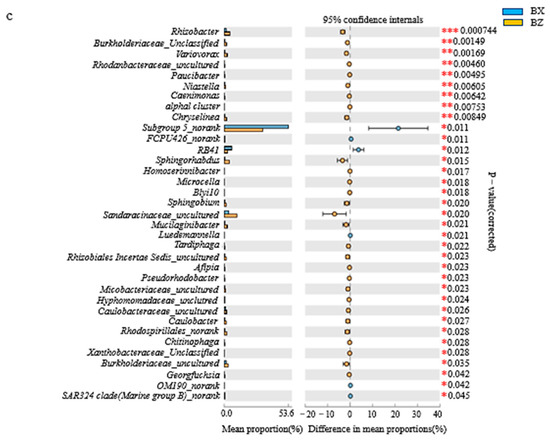 Figure 3a shows that there were 41 significant bacterial genus differences between the Korean pine plantation and the original Korean pine forest (p < 0.05), among which those of the Rhodanobacter microbes were the most significant (p < 0.001). Among them, Rhodanobacter, Caulobacteraceae_unclutured, WD260_norank, Acetobacteraceae_uncultured, and Micropepsaceae_uncultured were significantly higher in the plantation forest than those in the original forest. Subgroup 17_norank, Blastocatellaceae_uncultured, Desulfarculaceae_uncultured, Stenotrophobacter, and Subgroup 6_norank in the original forest were significantly higher than those in the plantation forest. According to Figure 3b, there were 31 bacterial genera in the middle and lower layers of the Korean pine plantation with significant differences (p < 0.05), among which that of the Paucibacter was the most significant (p < 0.001). Among them, Paucibacter, Caulobacter, and Mycobacterium were significantly higher in the middle layer than the lower layer. Figure 3c shows that there were a total of 35 bacteria genera with significant differences between the middle and lower layers of the original Korean pine forest (p < 0.05), of which those of Rhizobacter microbes were the most significant (p < 0.001). Rhizobacter was significantly higher in the middle layer than the lower layer.