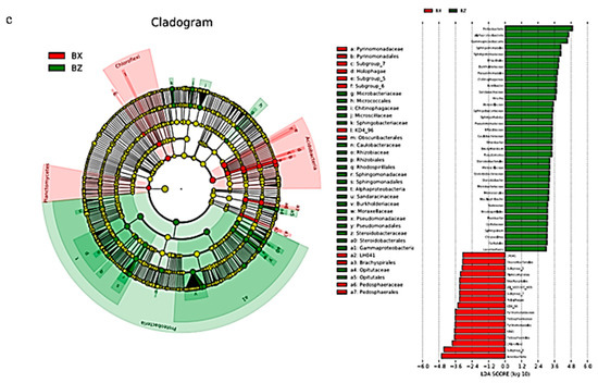 There were 34 biomarkers (LDA score >3) in the middle and lower levels of the original forest (Figure 4c), and there were 22 groups in the middle level of the original forest. On the whole, Proteobacteria, Alphaproteobacteria, and Gammaproteobacteria contributed the most to the middle level of the original forest. There were 12 groups in the lower layer of the original forest, of which Acidobacteria contributed the most, followed by Subgroup_6.