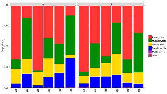 Fungal species structures of plantation forest litter (A) and original forest litter (B) at the phylum taxonomic level.