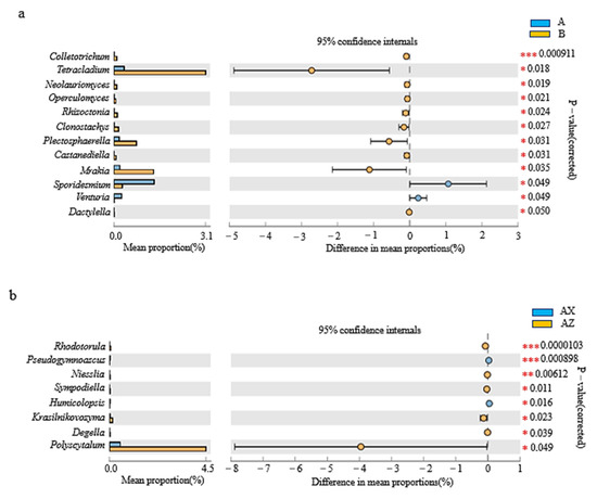 A Venn diagram is used to show the number of OTUs contained in the four forest litters. The total number of OTUs in the two types of forest litter was 680, among which 612 were specific to A and 820 were specific to B (Figure 5a). A total of 505 OTUs were found in the middle and lower layers of the plantation forest, among which 377 were AX-specific and 410 were AZ-specific OTUs (Figure 5b). There were 679 OTUs in the middle and lower layers of the original forest, among which 452 were BX-unique and 369 were BZ-unique OTUs (Figure 5c). Principal component analysis of the fungal-community composition of the four groups of forest litter in the plantation forest and the original forest showed that the contribution value of the first component of difference was 24.01%, the second was 13.8%, the third was 6.589%. Among them, forest distance between the three lower samples explains community composition similarity. Other samples were relatively dispersed, indicating large differences in OTU composition. In the first principal component, the middle and lower groups were significantly separated, indicating that the community structure of the middle and lower fungi was significantly different. In terms of the second principal component, the samples were not significantly separated for fungi. In terms of the third principal component, the two groups of original forest and plantation forest could be significantly separated, indicating that the community structure of the original forest and plantation forest was significantly different (Figure A2, Appendix A).