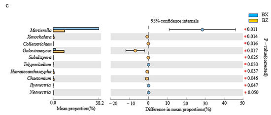 The abundance of dominant fungi in litter was analyzed at the genus level. According to Figure 7a, between the plantation forest and the original Korean pine forest, there were 12 fungal genera with significant differences (p < 0.05), among which Colletotrichum had the most significant difference (p < 0.001); the fungal genera of the original forest were significantly higher than those of the plantation forest. According to Figure 7b, there were 8 fungi genera in the middle and lower layers of the Korean pine plantation forest, with significant differences (p < 0.05), among which Rhodotorula had the most significant difference (p < 0.001); among them, Rhodotorula was significantly higher in the middle layer than in the lower layer, and Pseudogymnoascus was significantly higher in the lower layer than in the middle layer. According to Figure 7c, there were a total of 10 fungal genera in the middle and lower layers of the original Korean pine forest, with significant differences (p < 0.05), among which Mortierella had the most significant difference (p < 0.05), and the lower layer was higher in dominant fungi than the middle layer.