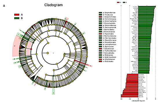 LEfSe analysis had 14 biomarkers (LDA score >3; Figure 8c) in the litter layer of the original forest. There were 9 groups in the middle layer of the original forest. On the whole, the largest contribution to the middle of the forest was from Ascomycota, followed by Leotiomycetes, Sordariomycetes, Erysiphales, Erysiphaceae, and Golovinomyces. There were 5 taxa in the lower layer of the original forest. The Mortierella genus contributed the most to the lower layer of the original forest, followed by Mortierellales, Mortierellomycetes, Mortierellaceae, Mucoromycota, Sarocladiaceae, and Sarocladium.