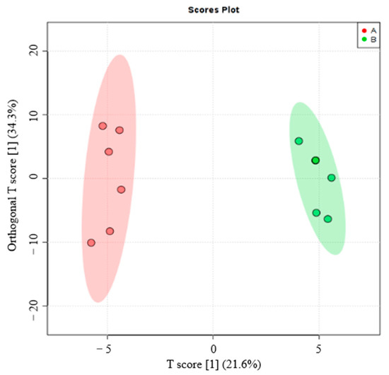 The orthogonal projections of the latent structure discriminant analysis (OPLS–DA) model was established by using software-automated model-fitting analysis and replacement tests. The model showed good robustness and no overfitting phenomenon, and a PCA score graph was drawn. Samples were in a significantly dispersed state, so there was a significant difference in the metabolic status of the samples. The distribution of the samples in the plantation forest and original forest groups showed a certain degree of differentiation, and the samples had a uniform degree of differentiation, which allowed for the next differential metabolite screening (Figure 9).