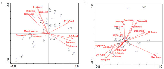 Canonical correspondence analysis of microbial relative abundance and differential metabolites. (a) Canonical correspondence analysis of relative abundance and differential metabolites of bacteria. Different numbers represent different bacterium genera: 1, Acidibacter; 2, Acidobacteriales_norank; 3, Bradyrhizobium; 4, Bryobacter; 5, CandidatusSolibacter; 6, CandidatusUdaeobacter; 7, Chitinophagaceae_uncultured; 8, Chthoniobacter; 9, Dongia; 10, Ferruginibacter; 11, Flavobacterium; 12, Gemmatimonadaceae_uncultured; 13, Haliangium; 14, Hirschia; 15, Micropepsaceae_uncultured; 16, Microscillaceae_uncultured; 17, Pedosphaera; 18, Phenylobacterium; 19, Rhodanobacter; 20, SC-I-84_norank; 21, SWB02; 22, Saccharimonadales_norank; 23, Sandaracinaceae_uncultured; 24, Sphingomonas; 25, Subgroup 2_norank; 26, Subgroup 6_norank; 27, Xanthobacteraceae_uncultured; 28, Mucilaginibacter. (b) Canonical correspondence analysis of relative abundance and differential metabolites of fungi. Different numbers represent different genera: 1, Cercospora; 2, Chalara; 3, Chloridium; 4, Clitocybe; 5, Dactylaria; 6, Golovinomyces; 7, Graphilbum; 8, Hymenoscyphus; 9, Lactarius; 10, Mortierella; 11, Mrakia; 12, Mycoarthris; 13, Mytilinidion; 14, Phialea; 15, Phialocephala; 16, Polyscytalum; 17, Pseudoanungitea; 18, Russula; 19, Sporidesmium; 20, Sympodiella; 21, Tetracladium; 22, Tomentella; 23, Trichoderma; 24, Xenochalara; 25, Xenopolyscytalum.