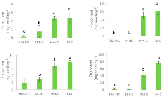 Significant increases in Pb (p = 0.004), Zn (p = 0.0001), and Cd (p ≤ 0.03) contents of the seedling shoots for M-C and NM-C treatments were noted compared to the control. No significant difference was found between NM-C and M-C for shoot Pb (p = 0.999), Zn (p = 0.226), and Cd (p = 0.592) accumulation at the end of the experiment in contaminated soil (Figure 3a). Likewise, Pb, Zn, and Cd root content significantly increased for both M-C and NM-C (p ≤ 0.01) compared to the control soil. This effect was more pronounced in the presence of mycorrhizae in the contaminated soil (M-C), but only for Zn and Cd. The increase of Zn root content was 30-fold higher for M-C (p = 0.0001) and 17-fold higher for NM-C (p = 0.001) relative to the control. Cadmium increased 9.5 times higher (p = 0.01) for NM-C and 14 times higher (p = 0.0001) for M-C compared to the control. In contaminated soil, mycorrhizal seedlings (M-C) contained higher Zn and Cd than non-mycorrhizal ones (NM-C); these increases were 1.81 times and 1.48 times higher, respectively. No difference was detected (p = 0.149) for Pb content between NM-C and M-C (Figure 3b).