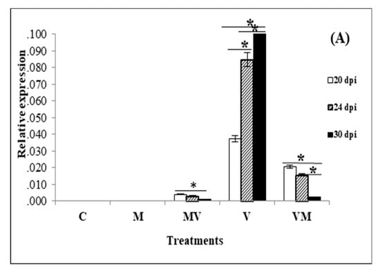 Total RNA was extracted from young leaves of C, M, MV, V, and VM plants at 20, 24 and 30 dpi by using RNeasy Mini Kit (Qiagen, Hilden, Germany). It is known that virus accumulation varies in different tissues and leaves with different ages [22]. Since the effect of age was not the focus of our study, and to avoid possible variation among plant tissues for virus accumulation and gene expression, all tests were conducted on only a single young leaf (second leaf from top) for each plant. In addition, to prevent potential effect form wounding during sampling on plant gene expression, tissue samples were freezed in liquid nitrogen immediately after collection [23,24]. The samples were then grinded to obtain a homogenized powder, and then RNA was extracted from an individual new leaf (~100 mg) for each treatment.