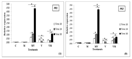 Mycorrhizal colonization is restricted to plant roots. However, its physiological influence may extend beyond to the aboveground non-colonized section of the plant. This systemic effect can be deciphered through gene expression levels in the mycorrhizal plants’ aboveground tissues. For instance, a large number of genes that are associated with defense or stress response were up-regulated in the mycorrhizal Medicago truncatula shoots [8]. Nevertheless, in mycorrhizal tomato plants, PR encoding genes were reported to be down-regulated [21]. The PR proteins were discovered in various plant species [38]. Examples of PR proteins include: PR2 (b-1, 3-glucanase), PR3 (chitinase type 1, 2, 4, 5, 6, 7), PR5 (osmotins), PR1 (unknown), PR10 and PR8 (chitinase type 3) [39,40]. These PR proteins can be produced under a controlled PR genes expression mechanism against related pathogen attack. It has been previously reported that the protein isoforms PR1, PR2, and PR5 are specifically activated during infection with the pepper mild mottle virus (PMMoV) [41]. In another study, viral infection with the Beet severe curly top virus (BSCTV) amplified the expression of several genes that plays a vital role in the salicylic acid pathways, including the PR1 gene [42]. Friorilli et al. [20], in a similar experiment, observed that PR protein expression decreased in the plants colonized with Glomus mosseae.