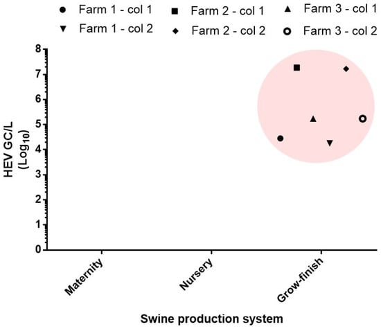 Environmental contamination is a relevant transmission route for HEV. Parashar et al. [] detected HEV by RT-qPCR in soil until at least nine weeks. Andraud et al. [] demonstrated that the environmental HEV load is important route for domestic pig contamination: infected animals may excrete more than 106 HEV GC g−1 of feces, but inocula with titres higher than 106 HEV GC L−1 are required for efficient infection of animals and promotion of virus spread. In the present study, high HEV loads (>6 log10 HEV GC L−1) in swine raw manure of pig grow-finish farms were observed, representing a significant risk of contamination for the animals of the herd. Although HEV is more frequently detected in feces than serum and liver samples from infected animals [,,], the foodborne hepatitis E risk through consumption of pig meat or derived products cannot be discounted.