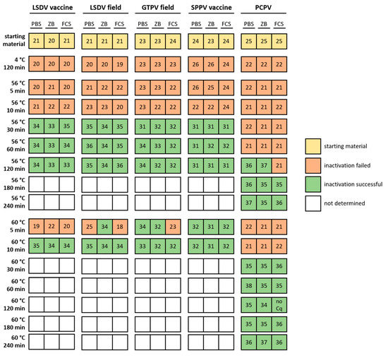 All four CaPV isolates were fully inactivated after 30 min at 56 °C or 10 min at 60 °C, independent of the dilution medium used (Figure 1, Supplemental Table S1). In contrast, the first successful inactivation of PCPV at 56 °C could be observed after 2 h in two of three sample matrices (PBS and ZB). Moreover, 10 min at 60 °C was also not sufficient for inactivation of the used PCPV isolate. Here, 180 min at 56 °C or 30 min at 60 °C were necessary for the reliable inactivation of all replicates in the different sample matrices (Figure 1, Supplemental Table S2).
