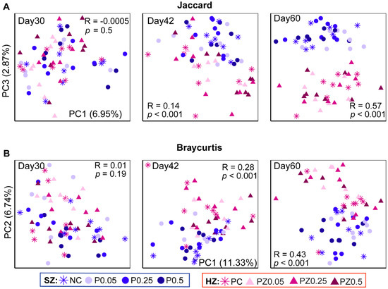 3.2. Effects of Peptide Plus ZnO on Alpha and Beta Diversity