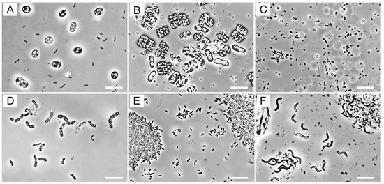 Phase-contrast microscopy showed that the morphotypes of the phototrophic bacteria were quite different from sample to sample. Representatives of the phase-contrast micrographs are shown in Figure 1.