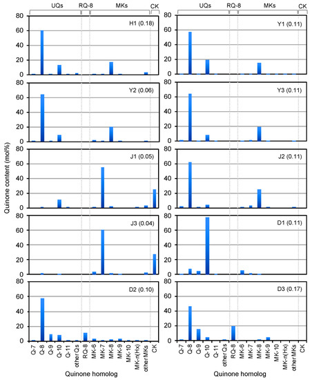 Quinone profiling studies showed that the red and pink samples H1, Y1–3, and J1 contained Q-8 as the predominant quinone and MK-8 or Q-10 as the second most abundant components (Figure 2 and Figure S3). On the other hand, the yellow-green samples J1 and J3 contained MK-7 and CK as the major quinone species. The ditch samples produced Q-10 (D1) or Q-8 (D2 and D3) as the most abundant quinones. Also, significant proportions of RQ-8, Q-9, and MK-9 were found in samples D2 and D3.